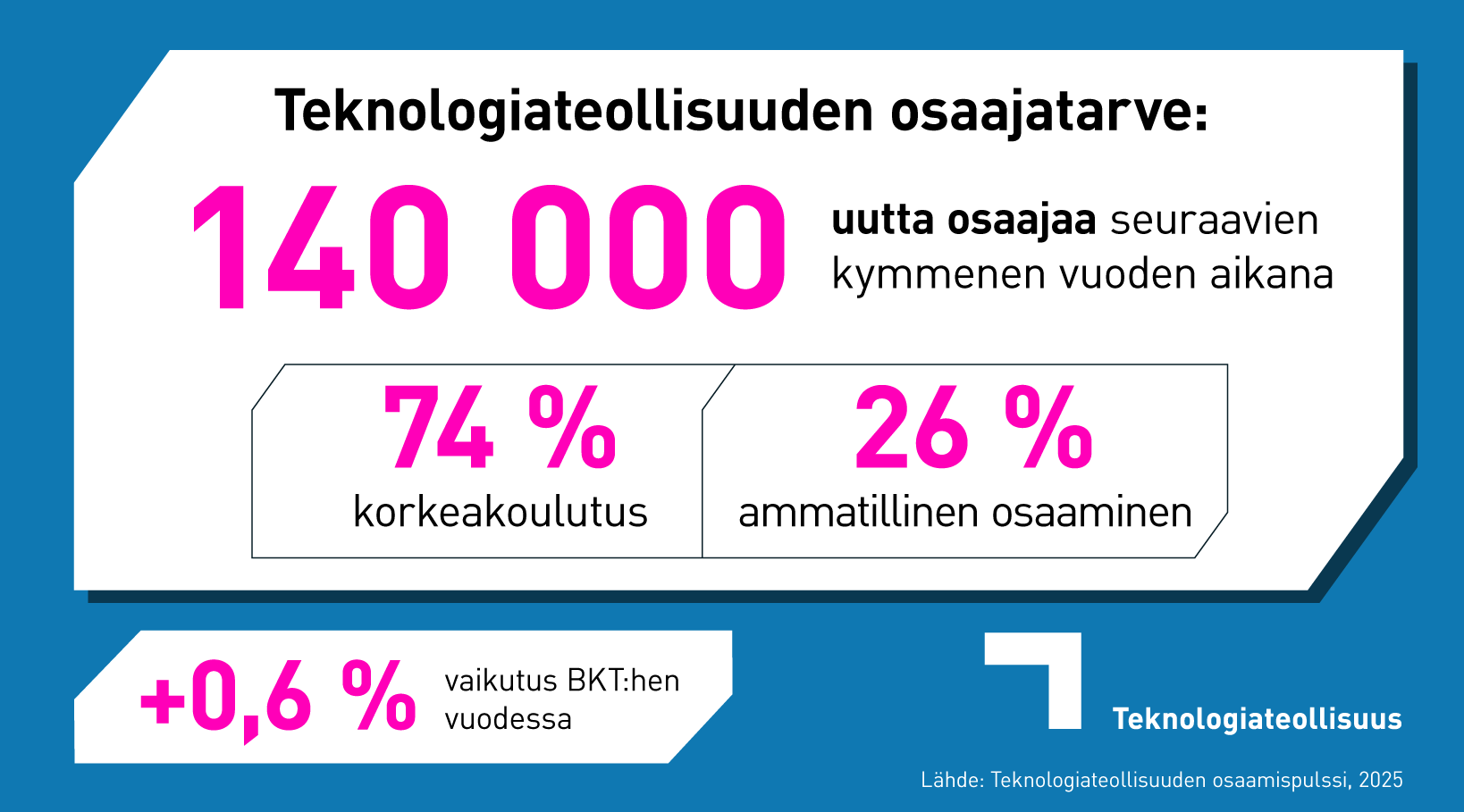 Teknologiateollisuus tarvitsee 10 vuoden aikana 140 000 uutta osaajaa, kertoo jäsenyrityksille tehty laaja kysely. Kyseessä on iso tavoite, sillä tällä hetkellä toimialalla työskentelee noin 330 000 ihmistä.